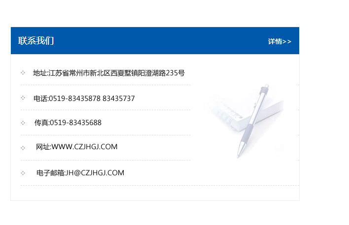 傳真:0519-83435688    郵編:213135    網址:WWW.czjhgj_com.efceo.com    電子郵箱:JH@czjhgj_com.efceo.com